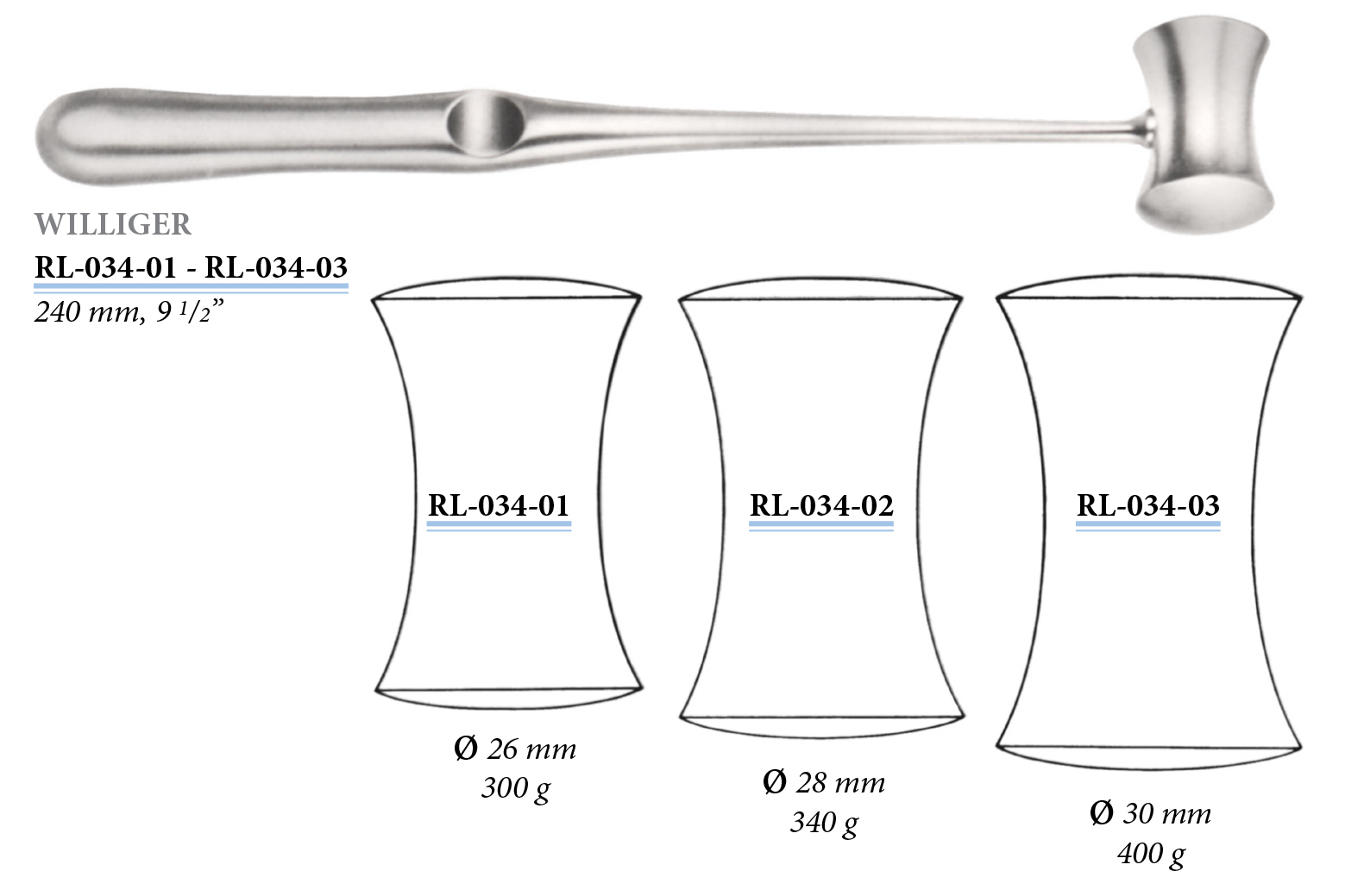 RL-034-01 Williger's mallet, diam. 26 mm, 300 g, 240 mm