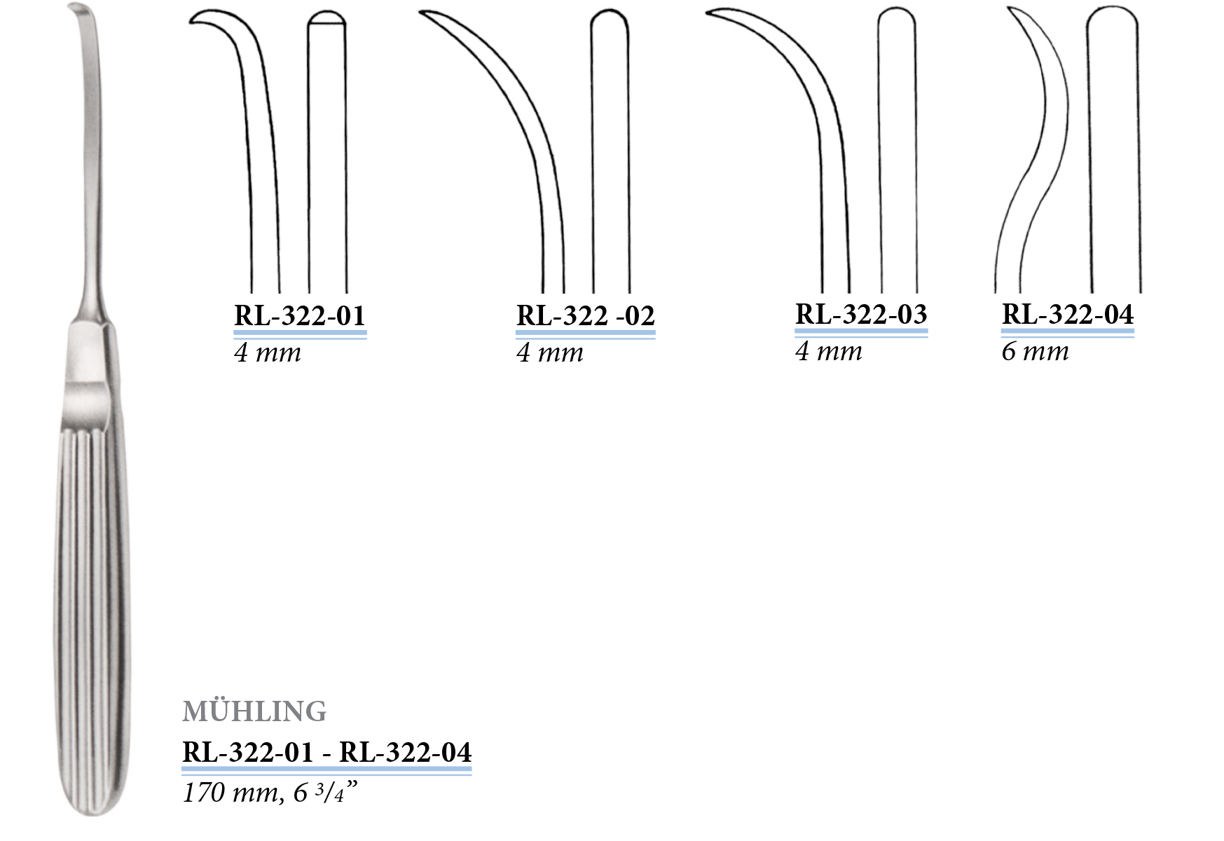 RL-322-01 Mühling's periosteal raspatory, curved, 4 mm, 170 mm