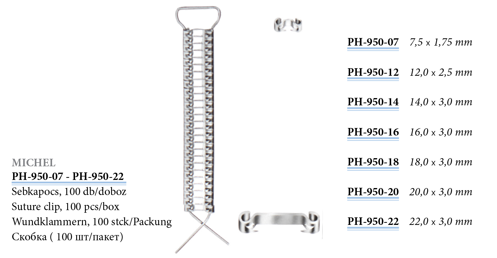PH-950-22 Michel's suture clip 22x3mm 100 pcs/box